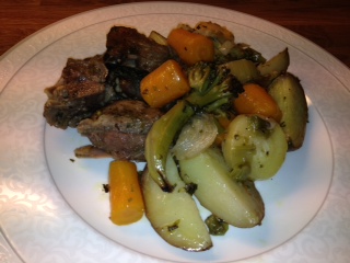Idag brukte jeg gulrøtter, persillerot og brokkoli av andre grønnsaker samt poteter delt i båter. (Om du ikke vil at brokkolien skal bli altfor godt stekt, er det lurt å tilsette den etter ca 45-60 min.)