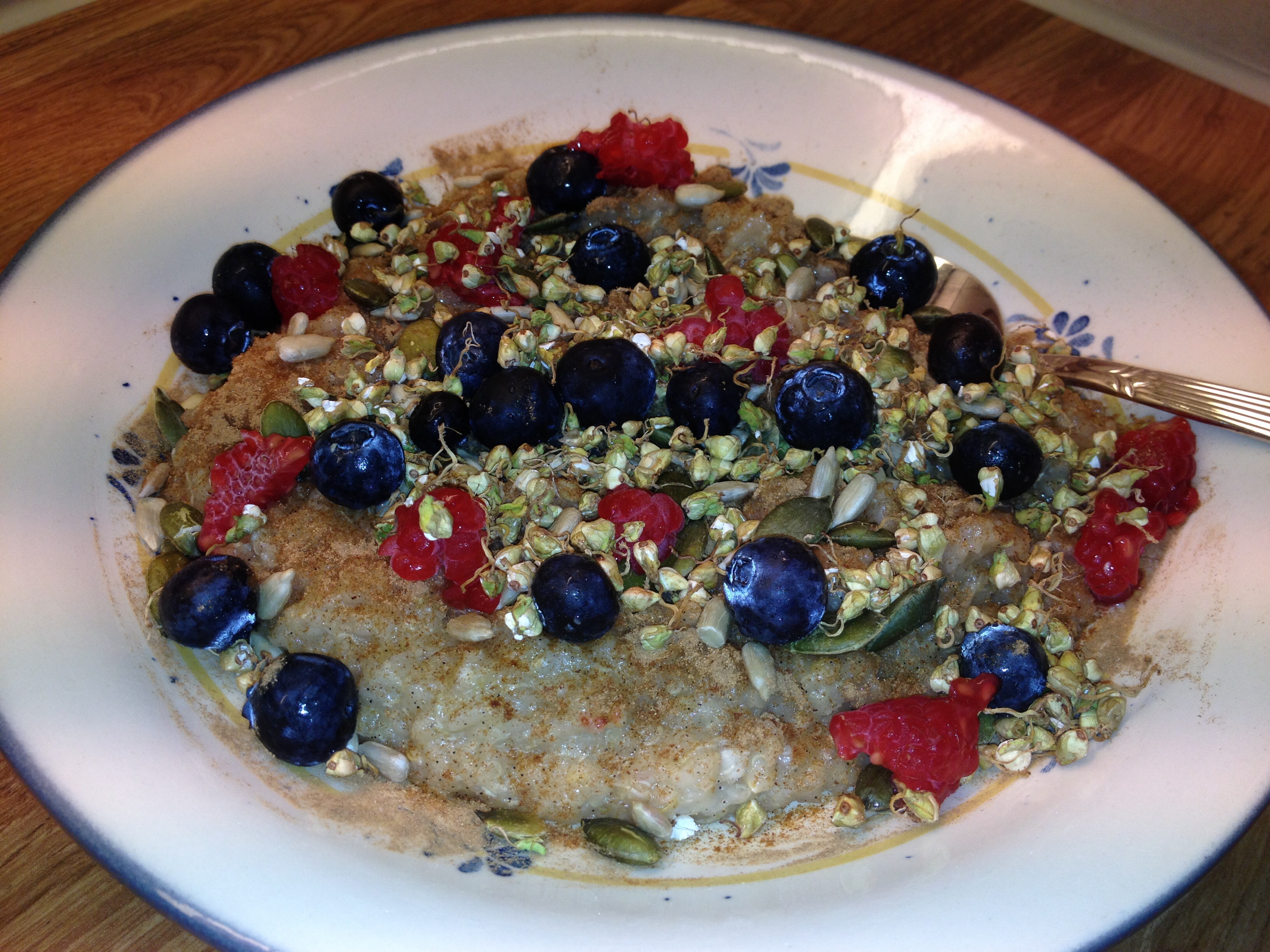 Mmmm, jeg har nytt en jentevennlig frokost idag, som jeg gjør så godt som hver dag: Idag ble det grøt av quinoa- og hirseflak og brun ris (rester fra middag) toppet med ceylonkanel, røstede frø og bær.