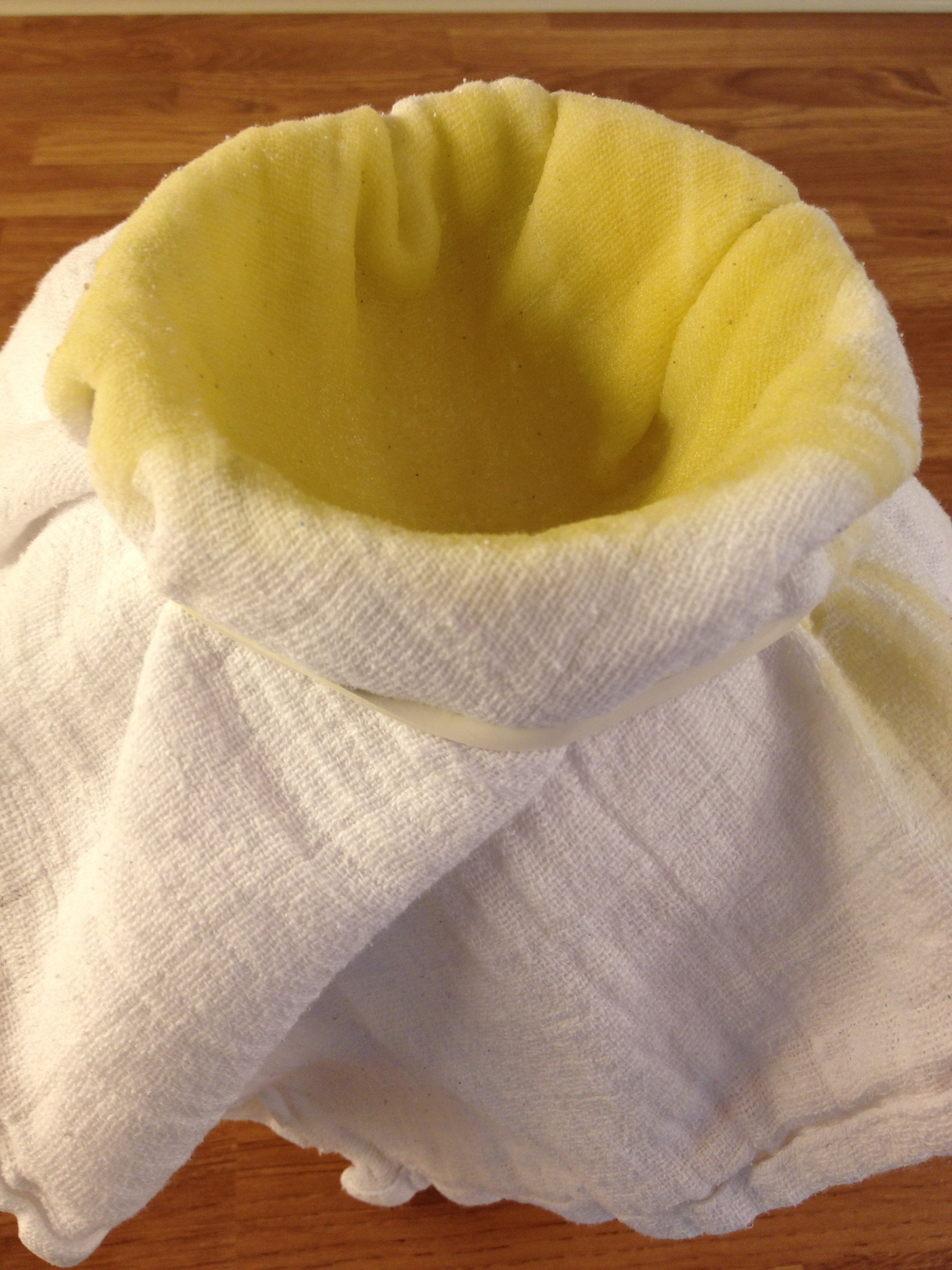 Her kan vi se melkeproteinene ligge igjen i kledet etter å ha silt nesten 1,5 kg.