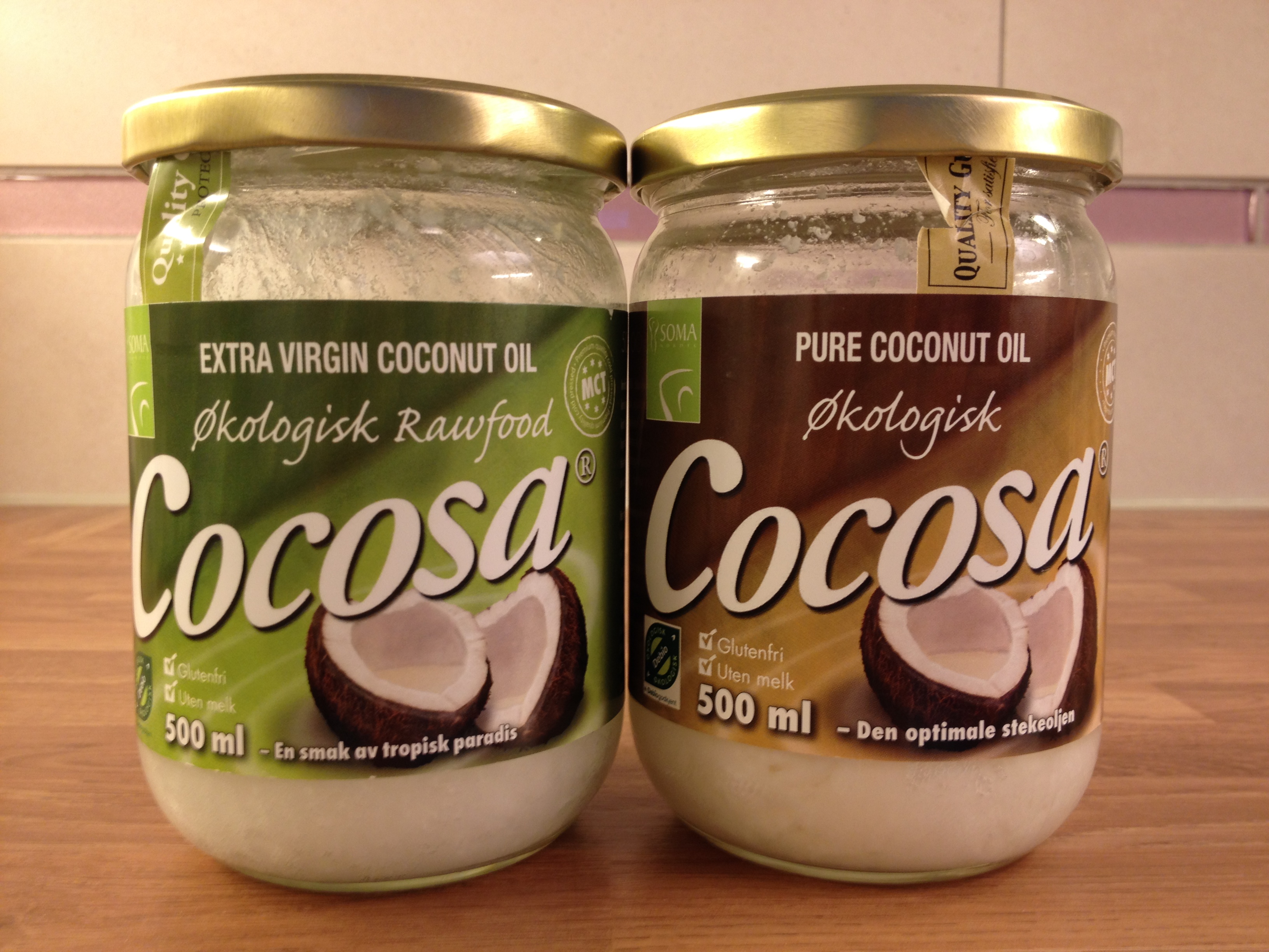 Kokosnøttolja til høyre kan du bruke til steking. Denne smaker ikke kokos. Olja til venstre er jomfruelig og har en nydelig smak av kokosnøtt. Denne tilsetter du etter at du er ferdig med å tilberede maten for å bevare de gode fettsyrene, vitaminene, mineralene og antioksidantene som denne oljen inneholder. Den jomfruelige kokosnøttolja smaker for eksempel fortreffelig i grøt (som du rører inn ved servering etter endt koketid). Det finnes selvsagt flere produsenter / leverandører av kokosolje. Oljene på bildet stammer fra en av de typene jeg bruker.